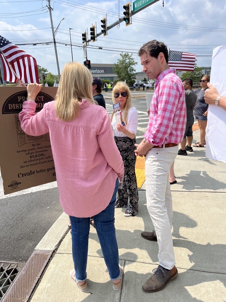 Mike Sacks with constituent holding sign calling out Mike Lawler healthcare doublespeak in Westchester County
